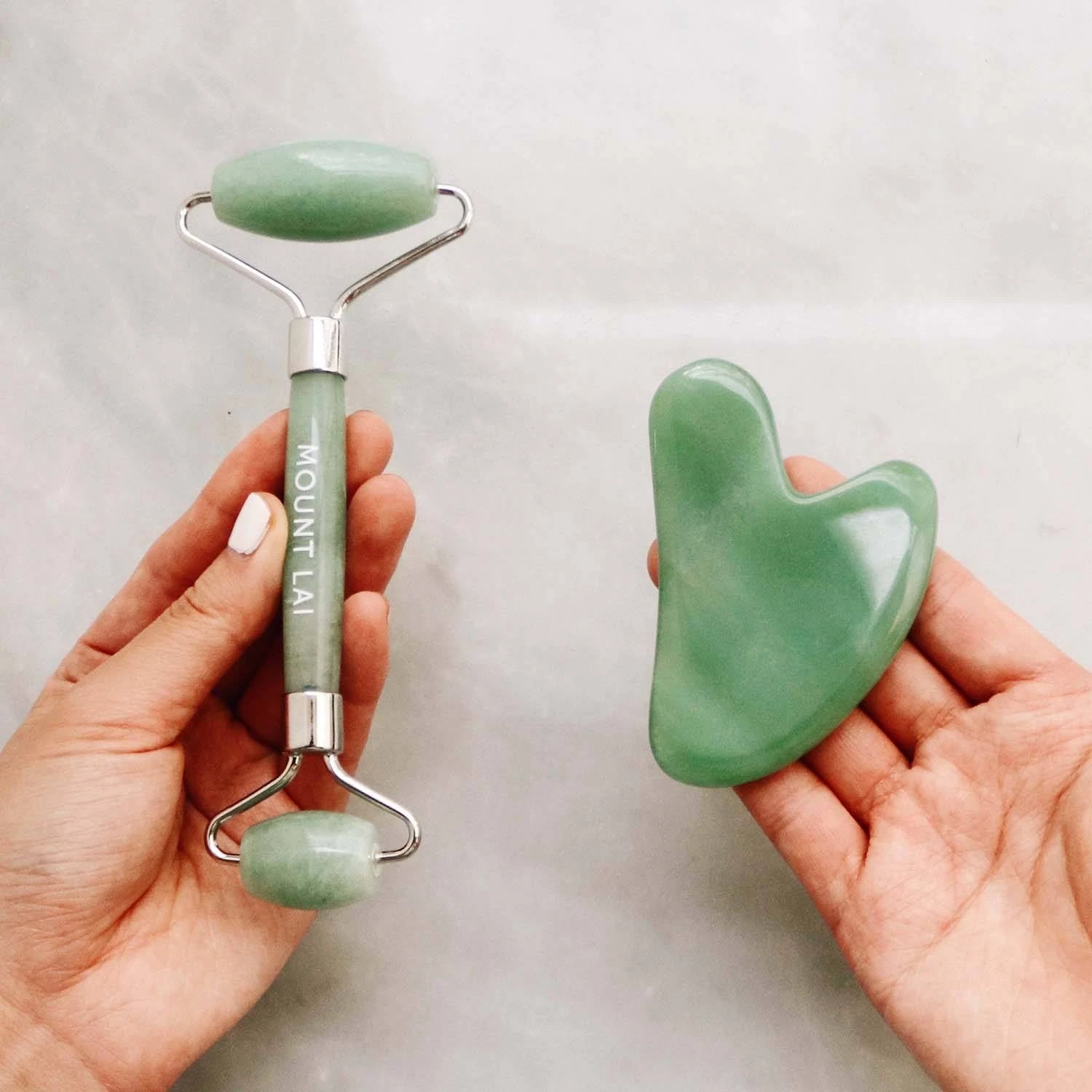 This Product Is: a powerful skincare duo containing a Jade Facial Roller and Jade Gua Sha Tool